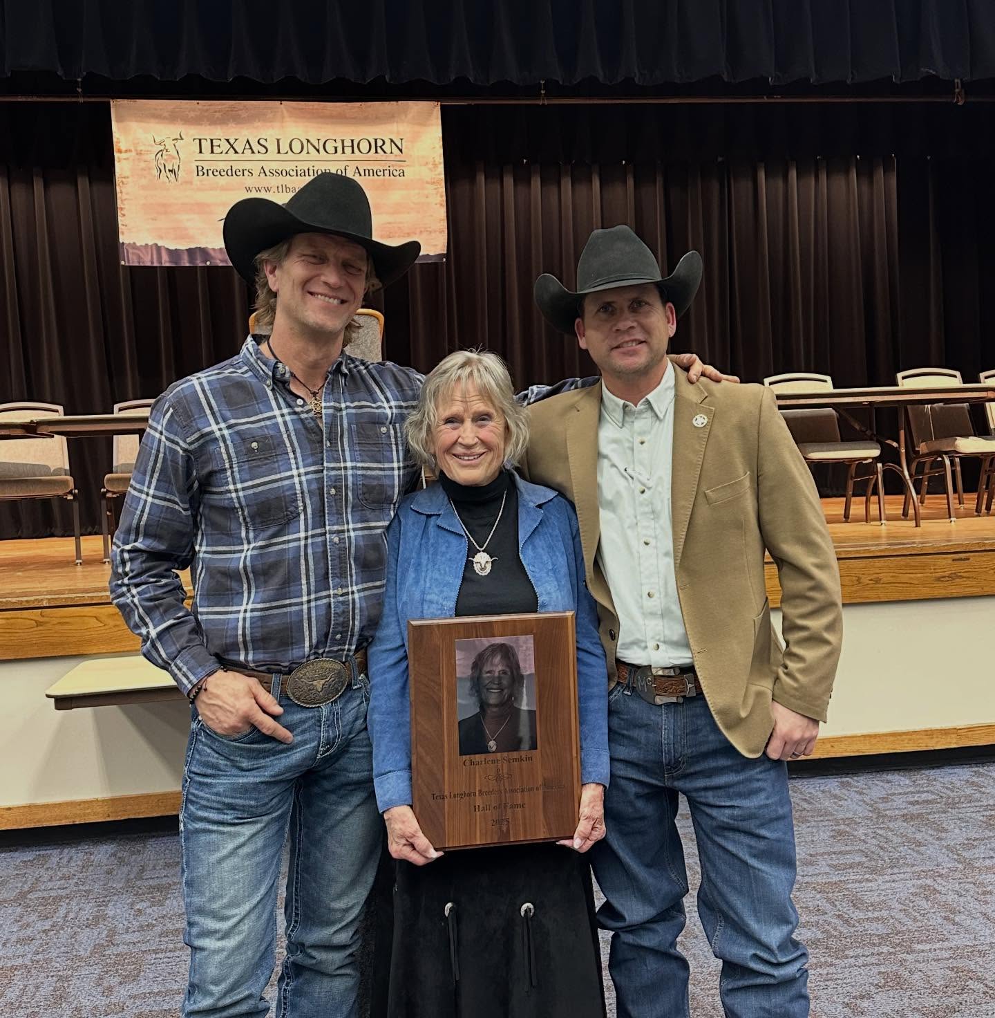 Matt McGuire & David Rogers with Charlene Semkin—the founder of Semkin Longhorns and the woman who started it all—be inducted into the TLBAA Hall of Fame. This is the highest honor a breeder can receive in the industry, and Charlene is the very first woman to earn this distinction. From beginning with her very first heifer, Alpha, to selling more than 1500 new breeders their first Texas Longhorn, Charlene has played a pivotal role not only in our operation, but in shaping a lasting legacy for the breed.